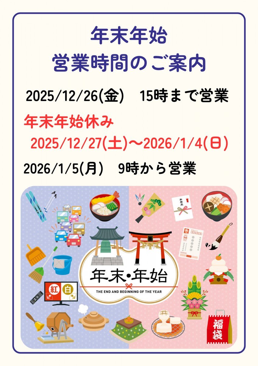 2025年12月26日(金) 9:00~15:00(短縮営業)